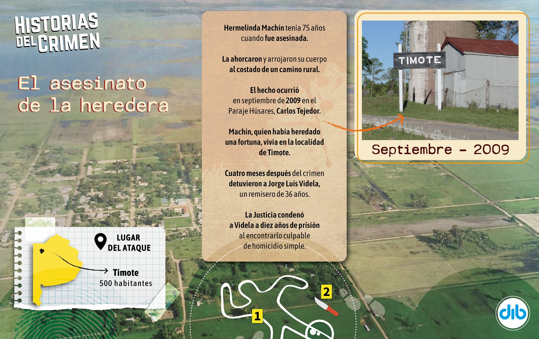Era en este poblado que hoy tiene unos 500 habitantes y donde historias y leyendas siguen surgiendo de cada uno de sus lugareños, donde vivía Hermelinda Machín, una mujer de 75 años. Pese a su vida austera, era una de las herederas de dos campos y varias propiedades, una fortuna valuada en varios millones de dólares que le había dejado su hermana tras un triste accidente. Pero a la tragedia que había vivido ella, se sumó la propia, y su cuerpo apareció asesinado al costado de un camino rural el martes 29 de septiembre de 2009.