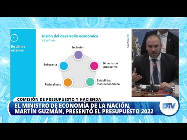 Guzmán expuso sobre el proyecto de ley de Presupuesto 2022 que contempla un crecimiento del 4%, una inflación del 33%, un dólar a diciembre del próximo año a $131,1, un déficit fiscal de 3,5%, un incremento real del gasto social y una reducción de los subsidios energéticos.