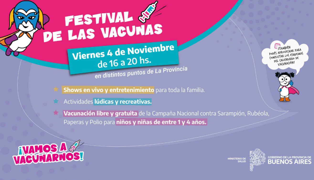Con shows en vivo, juegos y entretenimientos para toda la familia los municipios bonaerenses se preparan para el Festival de las Vacunas, que se realizará este viernes de 16 a 20, en el marco de la campaña de vacunación contra el sarampión, la rubeola, polio y paperas.