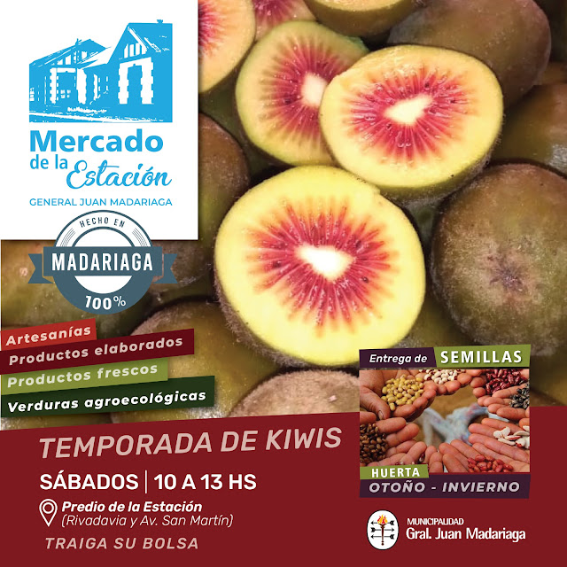 Este sábado desde las 10 a las 13 horas, en el Predio de la Estación sobre avenida Rivadavia entre doctor Carlos Madariaga y avenida San Martín, estará como de costumbre el Mercado de la Estación, con los artesanos, productos elaborados y frescos, verduras agroecológicos, repartos de semillas para huertas otoño e invierno, y comienza el tiempo de los kiwis de Macedo, llevar la bolsa.