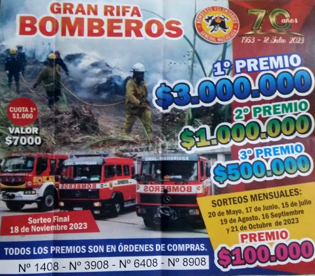Este sábado se realizara el segundo sorteo mensual de la Gran Rifa de Bomberos “En su 70 Años de su Fundación”, por Quiniela de la Ciudad Nocturna del sábado 17 de junio, y con una recompensa de $ 100.000, por boleta tiene cuatro chances, los próximos sorteos son el 15 de julio, 19 de agosto, 16 de setiembre y 21 de octubre. Y el sorteo final será el 18 de Noviembre de 2023, con un premio para el primero de $ 3.000.000, al segundo $ 1.000.000, y el tercero $ 500.000, en órdenes de compras.