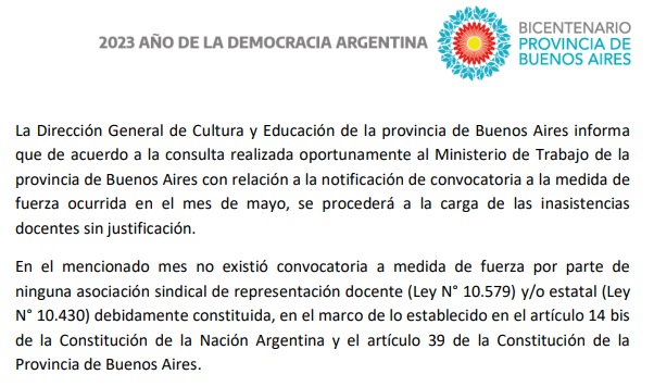 El mismo sostiene que “de acuerdo a la consulta realizada oportunamente al Ministerio de Trabajo de la provincia de Buenos Aires con relación a la notificación de convocatoria a la medida de fuerza ocurrida en el mes de mayo, se procederá a la carga de las inasistencias docentes sin justificación”.