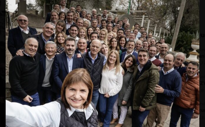 En la foto que acompaña la publicación están Bullrich y Grindetti en un primer plano y un grupo de personas detrás, donde se destacan Hernán Lombardi, Cristian Ritondo, Hernán Lacunza, entre otros.