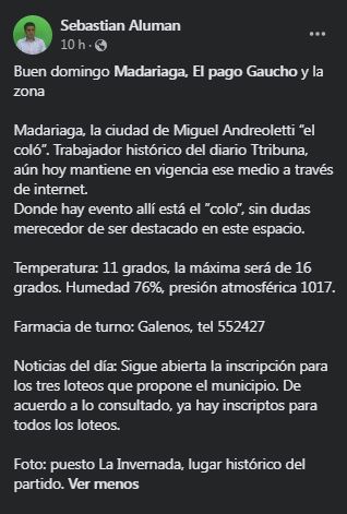 El conocido hombre del programa Primera Noticia en las mañana de LU28 Radio Tuyu y Canal 3 Divisadero, como lo es el periodista Sebastián Aluman, en su página de Facebook le dedica el día algún conocido personaje o institución de Madariaga, y le agrega la información del clima en la ciudad, la Farmacia de turno, y coloca alguna imagen de la ciudad.