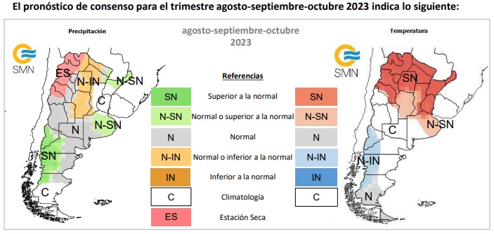 Mientras que se esperan lluvias normales para esta época del año “sobre la región de Cuyo, La Pampa, oeste de Buenos Aires y este de Patagonia”.