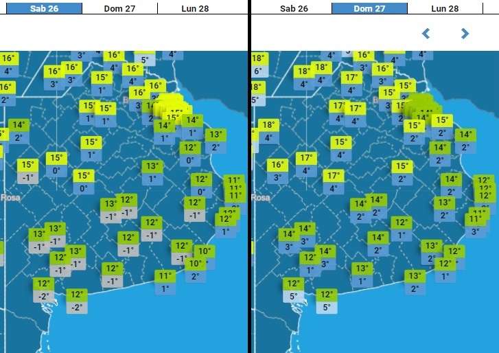 En distritos del norte y del oeste como Pergamino, Junín, Chacabuco, Pehuajó y Bolívar se esperan mínimas de 4 y máximas de 17, y en General Villegas la máxima del domingo alcanzará incluso los 18. En el sector costero las máximas estarán entre los 11 y los 13 grados, y en La Plata y distintas zonas del Área Metropolitana de Buenos Aires entre los 14 y 15. En ninguna parte de la provincia se esperan mínimas bajo cero para ese día. (DIB) MT