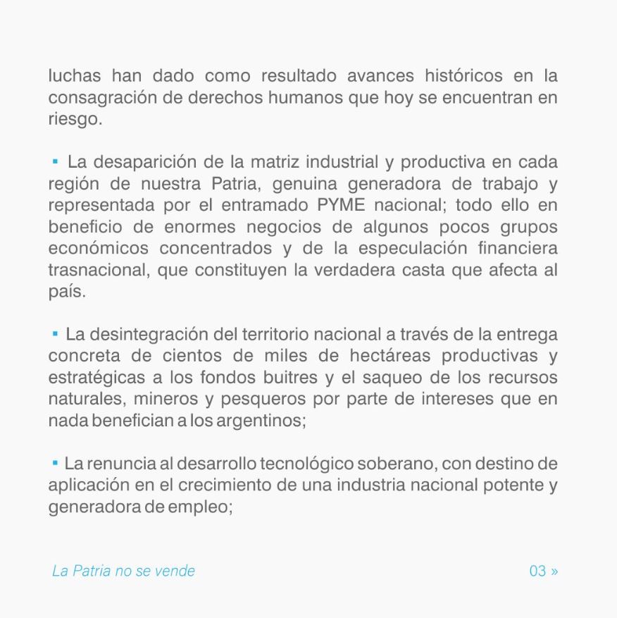 A través del lema “La patria no se vende”, 20 partidos, entre ellos el Partido Justicialista y el Frente Renovador, conducido por el excandidato presidencial de UxP, Sergio Massa, anunciaron que van a acompañar “todas las iniciativas multisectoriales, marchas, protestas y reclamos que viene sosteniendo el pueblo argentino a lo largo y ancho del país”, a la vez que exigieron al Congreso el “rechazo” a las iniciativas promovidas por el oficialismo.