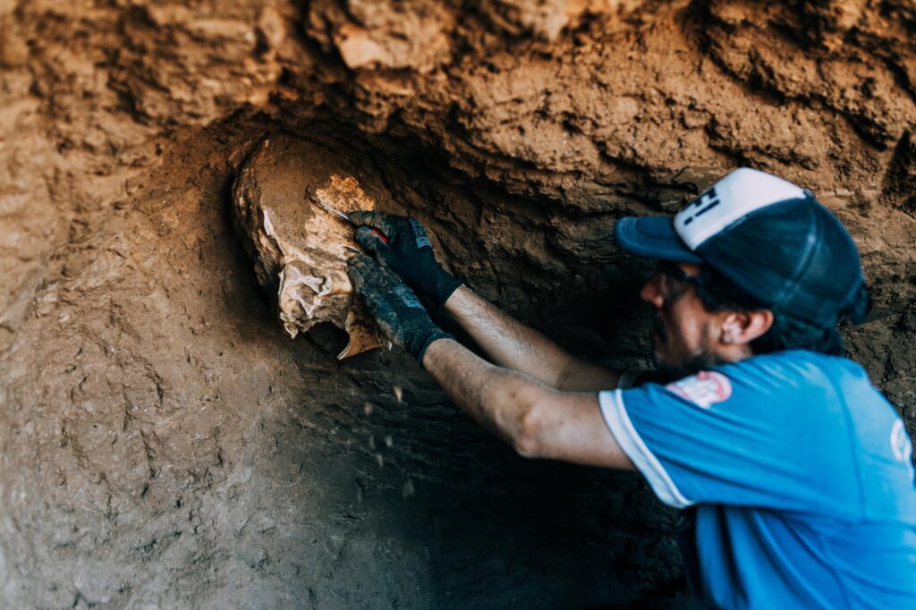 A 50 metros del lugar donde fue hallada la familia de perezosos terrestres gigantes, una colaboradora del equipo de paleontología del Museo Scaglia dio con uno de los animales prehistóricos más esquivos: Pampatherium typum. Se trata de un armadillo terrestre gigante con caparazón móvil similar en apariencia a un tatú carreta pero de mayor peso y tamaño: podía llegar a los 250 kilos y dos metros de largo.