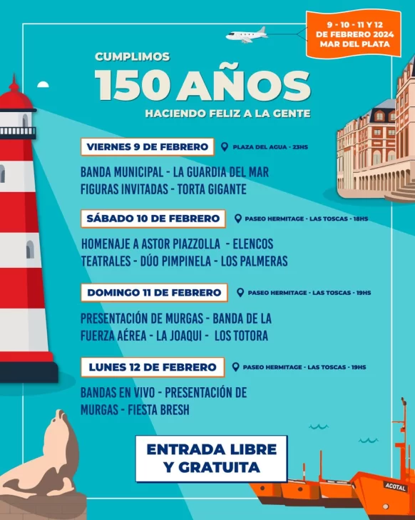 A dos semanas del aniversario por los 150 años, la ciudad de Mar del Plata celebrará el 10 de febrero, con una serie de actividades programadas que incluirán fiestas, recitales gratuitos de artistas como La Joaqui, Los Totora y Los Palmeras, desfiles náuticos, murgas y atractivos gastronómicos como una torta de 150 kilos y helados con forma de lobo marino.