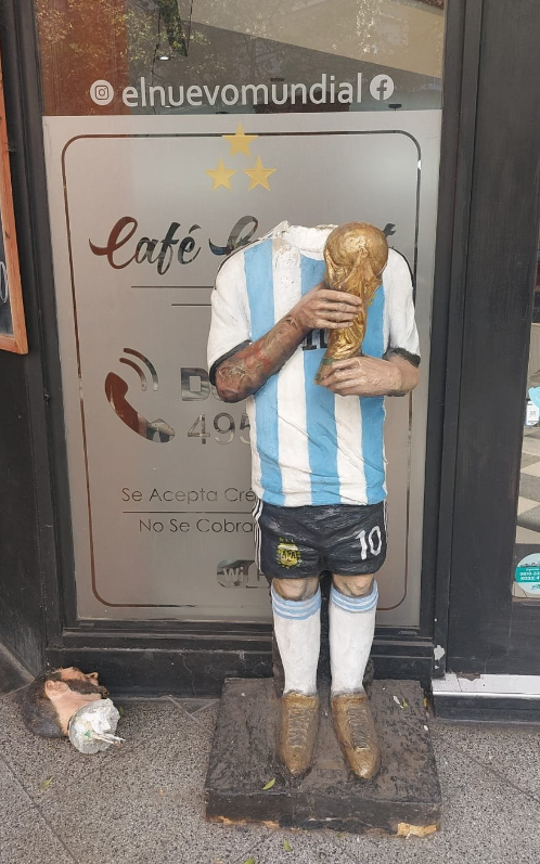 Un acto de vandalismo generó estupor y sorpresa entre quienes pasaron este jueves por la esquina de Santa Fe y Moreno, en Mar del Plata: la estatua en homenaje a Lionel Messi emplazada en el ingreso a un bar apareció decapitada.