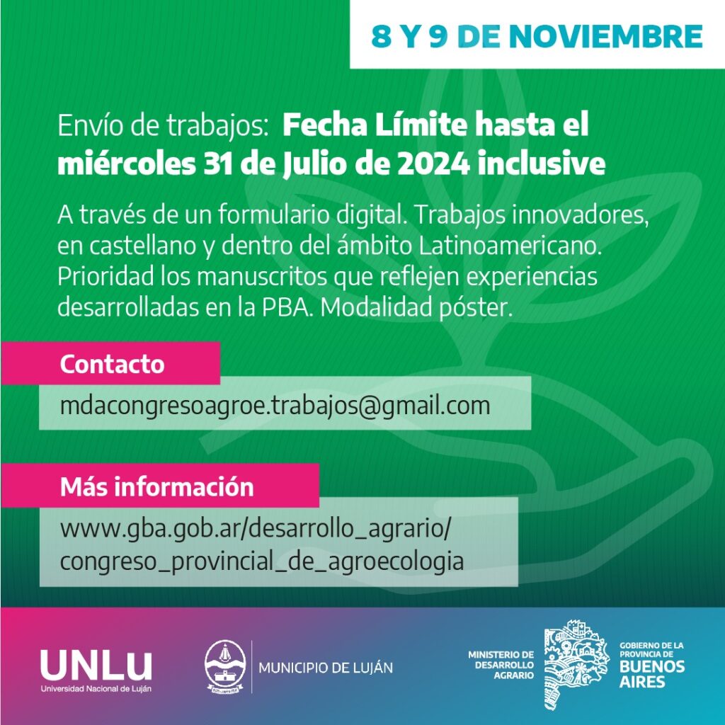 “Hasta el miércoles 31 de julio de 2024 inclusive”, continúa el texto, “se recepcionarán propuestas de trabajos y experiencias vinculadas a diferentes áreas temáticas: Sistemas Productivos Agroecológicos; Políticas Públicas vinculadas a la promoción de la Agroecología; Comercialización, Agregado de Valor y Sistemas Participativos de Garantía; Sujetos Sociales de la Agroecología, Enfoques de Género, Diversidad y Juventud; Educación y Agroecología; y Acceso a la Tierra, Hábitat y Ambiente”.
