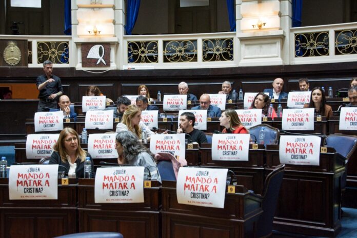 La bancada de Unión por la Patria bajó al recinto con pancartas con la leyenda “¿Quién mandó a matar a Cristina?”, una referencia a su denuncia sobre la falta de investigación de los autores intelectuales del intento de asesinato en su contra, que ella misma enarboló ayer por la mañana su declaración ante de TOF 6.
