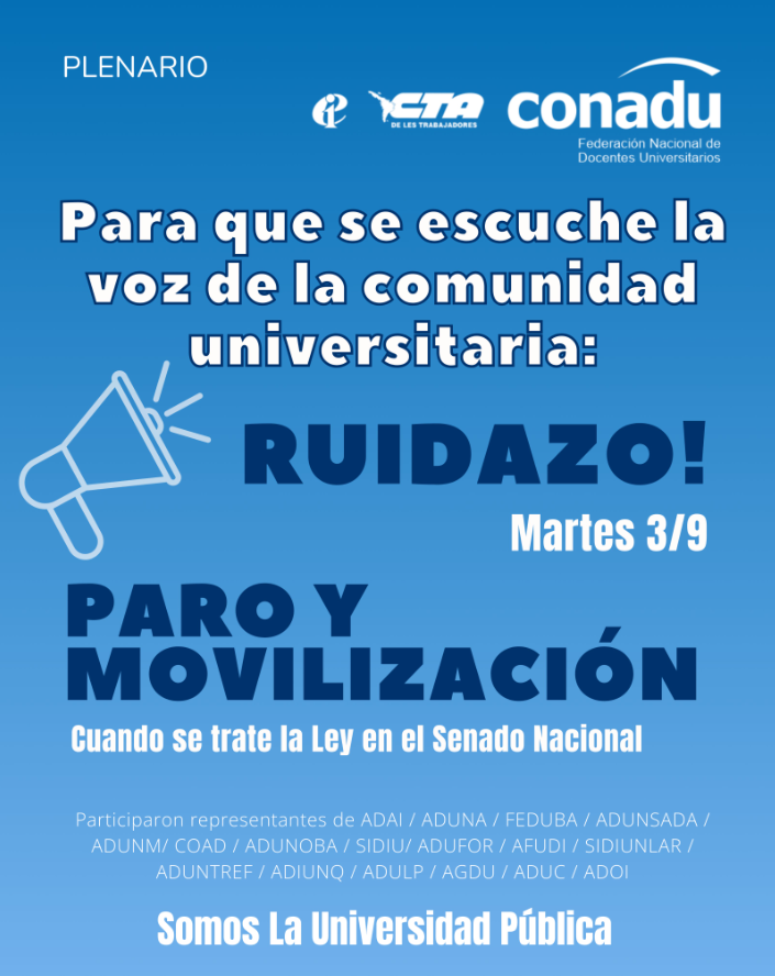 📌Realizar un gran “Ruidazo Nacional” el próximo martes 3 de septiembre, para que el Senado Nacional escuche el reclamo por la aprobación de la Ley de Financiamiento Educativo Universitario Nacional.
