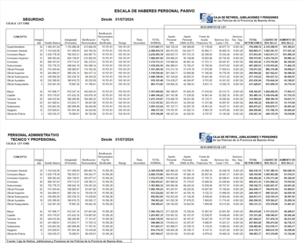 En el comunicado emitido por la Caja del Ministerio de Seguridad provincial se informó que “con los haberes de agosto, que se percibirá el segundo día hábil del mes de setiembre 2024, la Caja de Retiros, Jubilaciones y Pensiones de las Policías de la Provincia de Buenos Aires hará efectiva la escala de haberes pautada para Julio 2024 por el Gobierno Provincial para el personal de las Policías de la Provincia de Buenos Aires”.