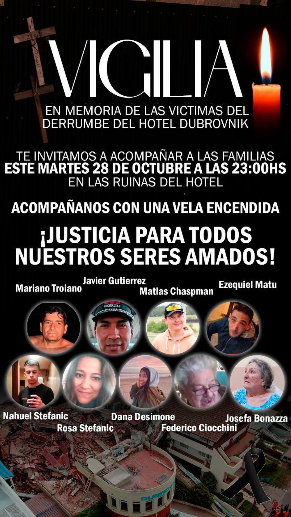 Cerca de la 0.30 de la madrugada del 29 de octubre de 2024 un terrible estruendo interrumpió el sueño de los habitantes de Villa Gesell: se había derrumbado la torre del Apart Hotel Dubrovnik, un edificio de diez pisos que estaba en remodelación. En su caída había destrozado también parte de un complejo de departamentos. En el siniestro fallecieron nueve personas, ocho en el momento y una sobreviviente un mes después. La principal hipótesis de la investigación apunta a que el derrumbe fue causado por las obras de refacción. Hay seis personas procesadas, entre arquitectos, albañiles y contratistas, bajo la carátula de “estrago culposo agravado por la multiplicidad de víctimas”. Mientras tanto, a un año de la tragedia los familiares de los fallecidos denuncian que la causa está “estancada”, y este miércoles llevarán a cabo una marcha a la Municipalidad geselina para reclamar justicia y una misa en recuerdo de las víctimas.