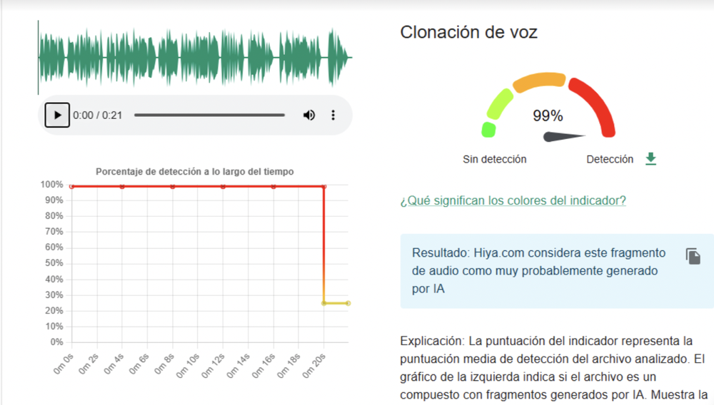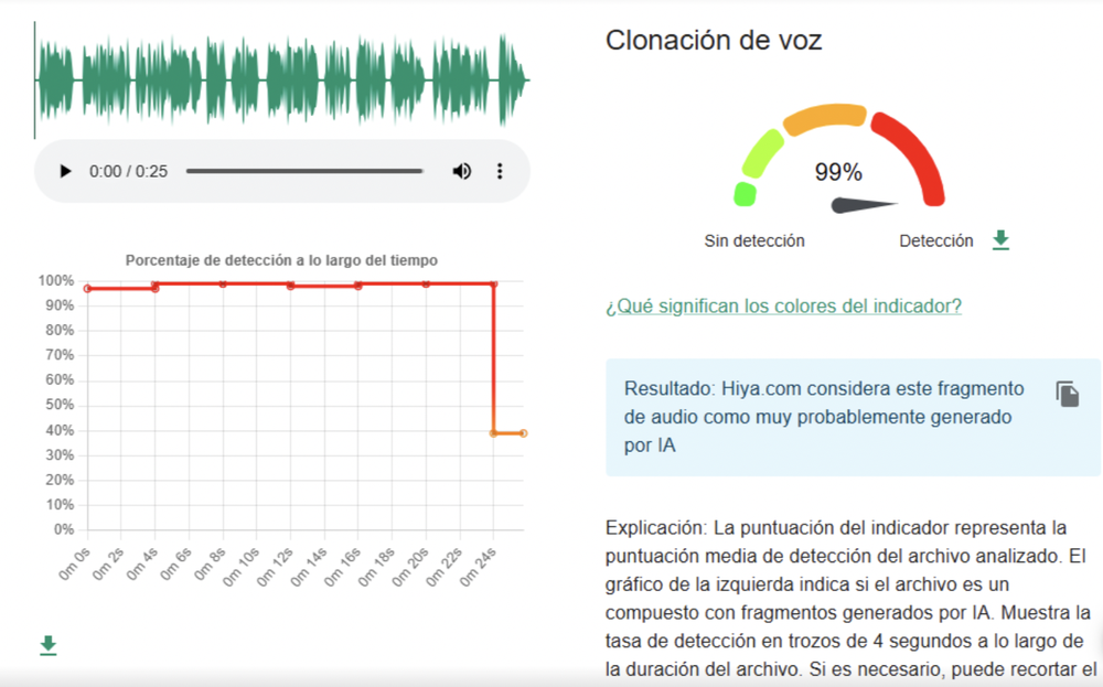 «El análisis de audio de InVid-WeVerify detecta la conversión de texto a voz generada por IA (clonación de voz por IA)», señala la herramienta.