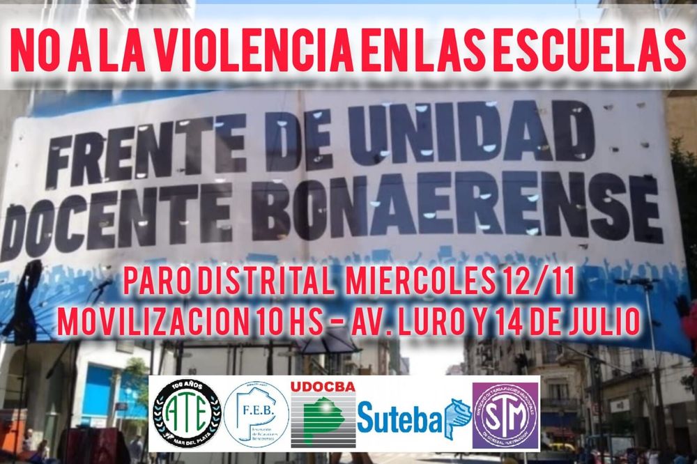 «No a la violencia en las escuelas. Miércoles 12 de noviembre paro distrital y movilización», reza el flyer que dieron a conocer desde el Suteba.