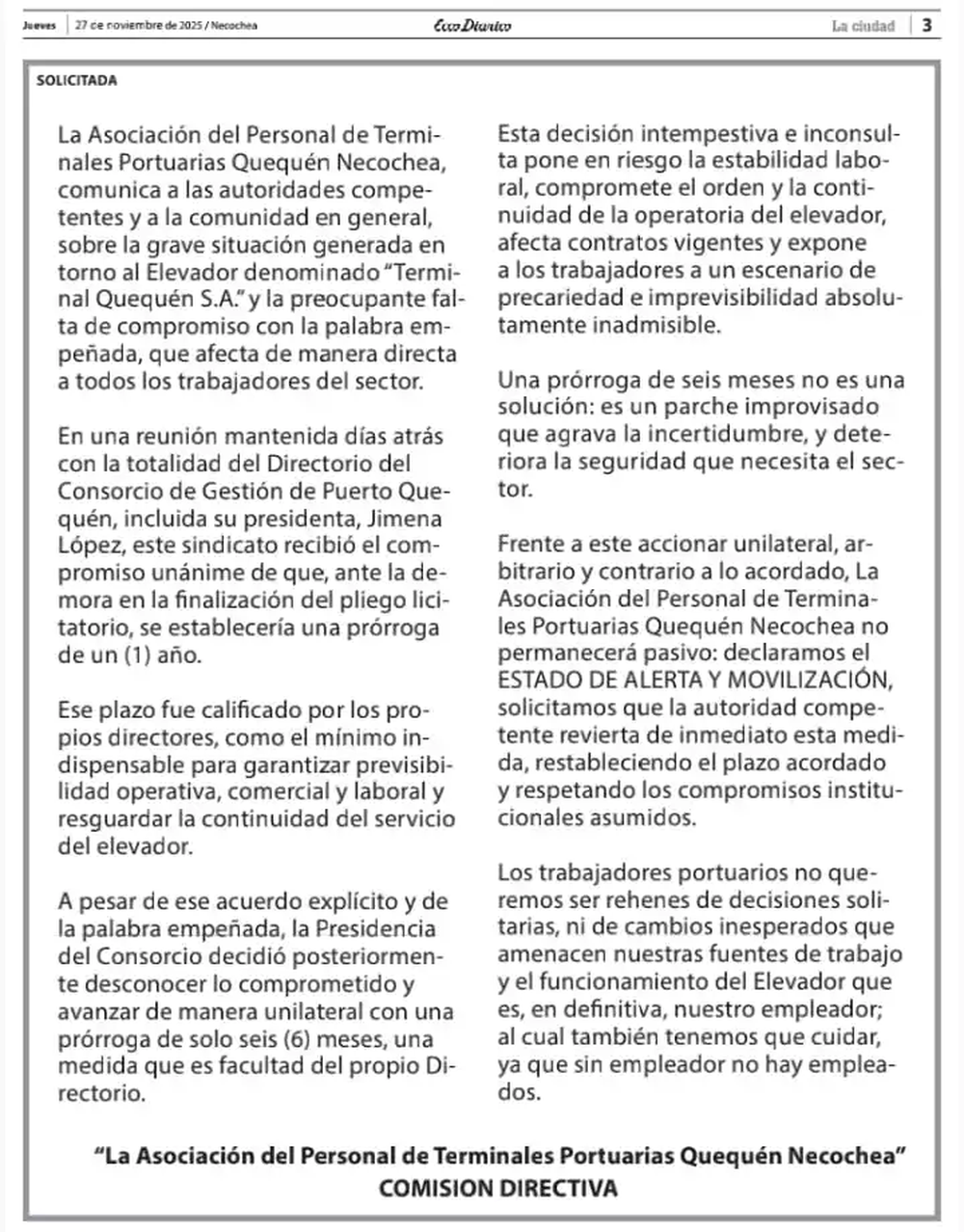 A través de un comunicado, la Asociación alertó sobre la grave situación generada en torno al Elevador denominado Terminal Quequén S.A. y la preocupante falta de compromiso con la palabra empeñada, que afecta de manera directa a todos los trabajadores del sector. El plazo de un año, destacaron, “es el mínimo indispensable para garantizar previsibilidad operativa, comercial y laboral y resguardar la continuidad del servicio del elevador”.