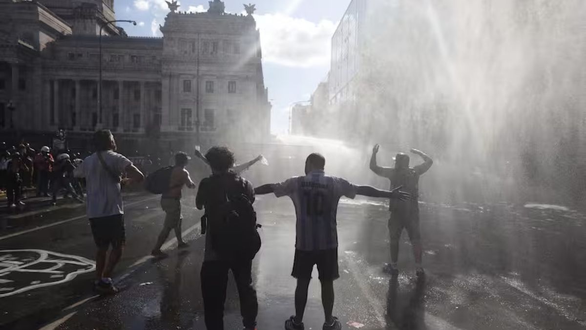 Después de que los encapuchados arrojaran botellas contra la policía, los efectivos permanecieron primero inactivos -con un cordón espaciado tras las vallas- pero tras los primeros incidentes accionó un carro hidrante, que durante buena parte de la tarde descargó ráfagas de agua para desarmar el frente de la protesta, en varias oledadas de ataques y réplicas.