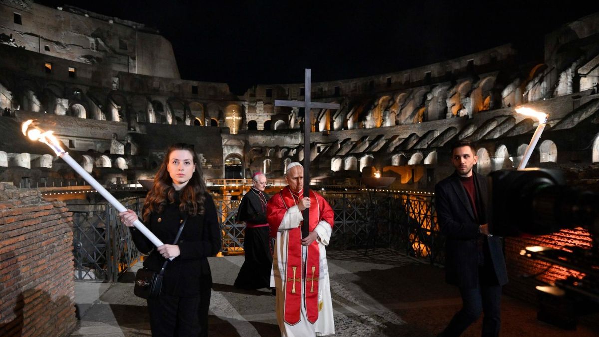 León XIV presidió, este viernes 3 de abril, en el Anfiteatro Flavio, su primer Vía Crucis (Camino de la Cruz), el rito que recuerda el camino de Jesús hacia el Gólgota, antes de su crucifixión. En su primer Viernes Santo como Pontífice, durante las 14 estaciones, cargó la cruz él mismo, acompañado por dos jóvenes con antorchas que iluminaban el sendero.